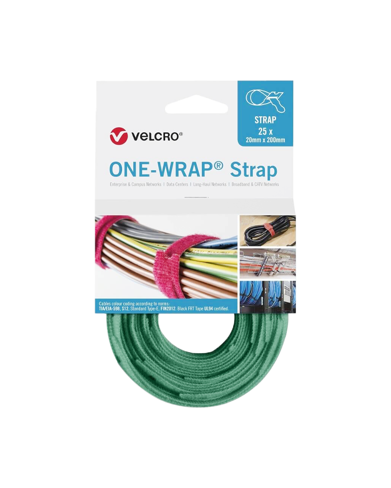 The Velcro One-Wrap 20x200mm green reusable cable tie is a wide offering of back to back tapes where hook and loop are woven, glued or extruded together and give different performance characteristics from high cycle life to disposable applications. Both hook and loop components of the closure are integrated in a single product.
